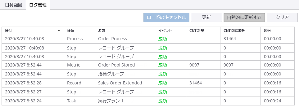 [データをロード] をクリックします。プランの実行中、各ステップのステータスが [ログ管理] 枠に表示されます。計画が正常に完了するまで待ちます。