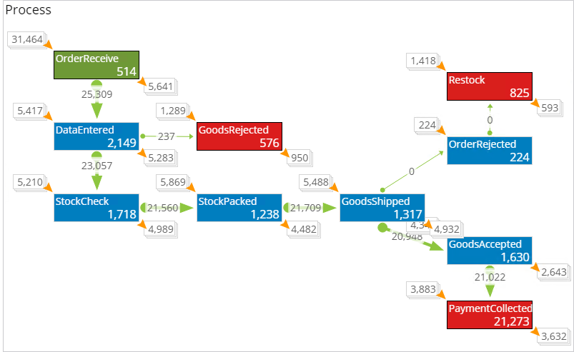 この演習を完了すると、ビジネス サイクル中にビジネスユニットが通常行う視覚的なプロセス (注文など) を設定できるようになります。次に、このプロセスに基づいて、注文がプロセス マイルストーン間でどのように分布しているか、およびプロセスがプロセスに正確に従っているかどうかの概要を示すグラフを作成できます。