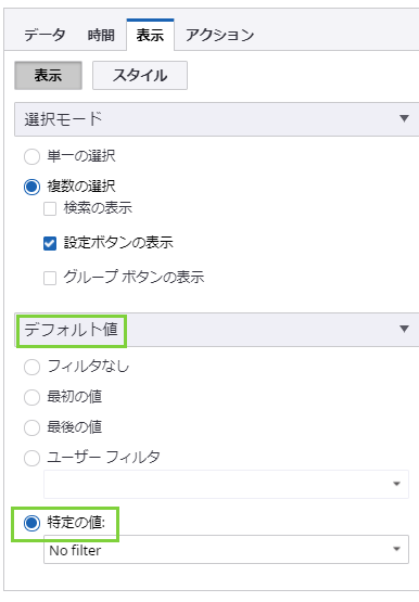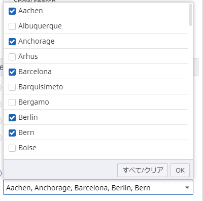 同じウィザードの [表示] タブの [デフォルト値] 領域で、[特定の値] を選択します。フィルタに必要な都市を選択するには、右側の矢印をクリックします。都市のリストが表示されます。Aachen、Anchorage、Barcelona、Berlin、Bern の横にあるチェック ボックスを選択します。次に、[OK] をクリックして選択を保存します。[OK] をクリックしてウィザードを終了します。