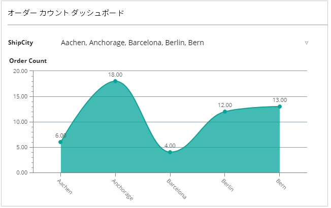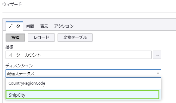 フィルタを配置した後に表示されるフィルタ コンポーネントのデータ ウィザードにある [ディメンション] ドロップダウン メニューで ShipCity を選択します。