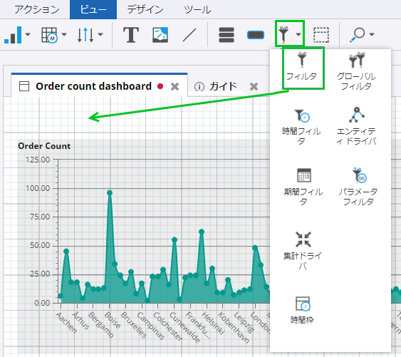 フィルタ メニューを開くには、[フィルタ] アイコンをクリックします。注文数ダッシュボードの近くまたは上にある基本的な [フィルタ] をクリックして、キャンバス領域にドラッグします。