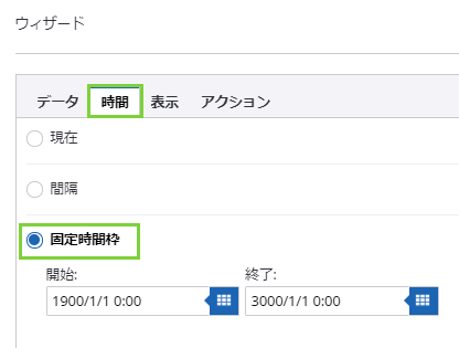 同じウィザードの [時間] タブで、このフィルタの時間範囲を選択します。このサンプルでは、1900/1/1 〜 3000/1/1 の [固定時間枠] を選択します。
