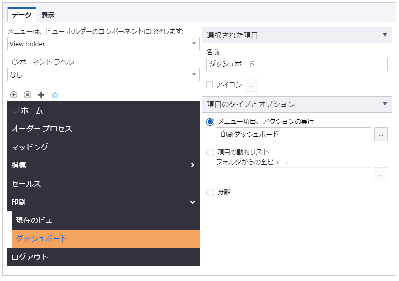 現在のビューを印刷:このアクションは、メニューまたはビュー ホルダー コンポーネントのあるビューからトリガーされ、ヘッダーなしでビュー ホルダー内のビューのみを印刷します。