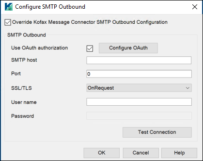 Override Kofax Message Connector SMTP Outbound Configuration checkbox to configure the SMTP