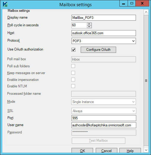 Password The password of the mailbox user. This field is disabled when you select the Use OAuth authorization check box. -
