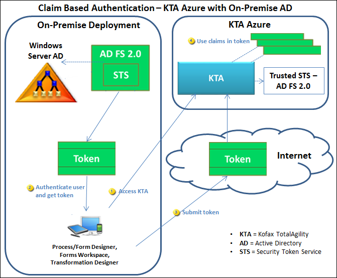 This scenario describes TotalAgility Azure or on-premise installed in the cloud using on-premise Windows Server AD FS 2.0 (as the identity provider).