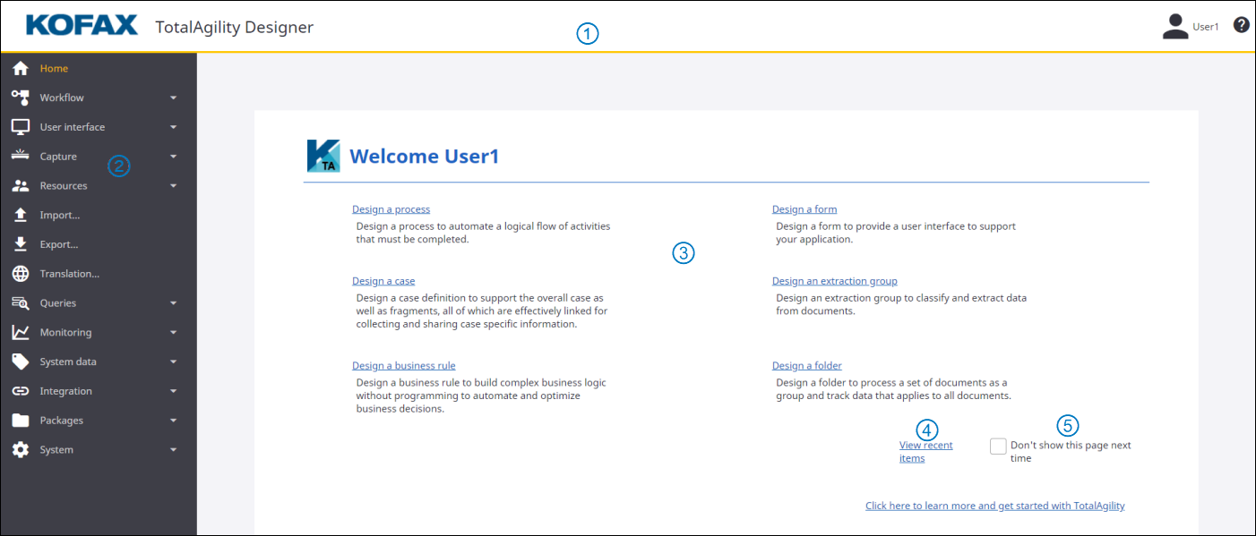 The default web page that loads when you log on to TotalAgility after a clean installation.