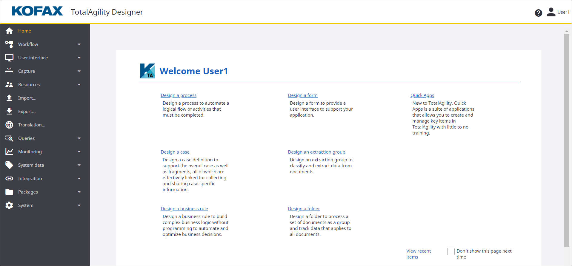 The default web page that loads after you install TotalAgility Designer for the first time and log on to it.