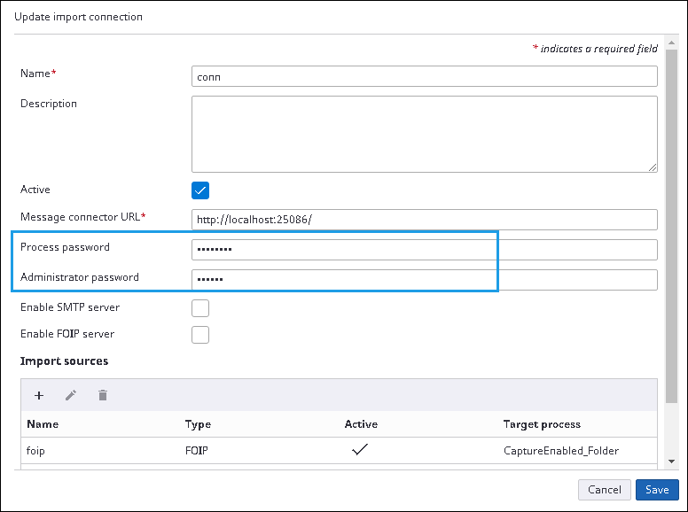 This example illustrates the use of process password and administrator password fields while configuring a file type of import source.