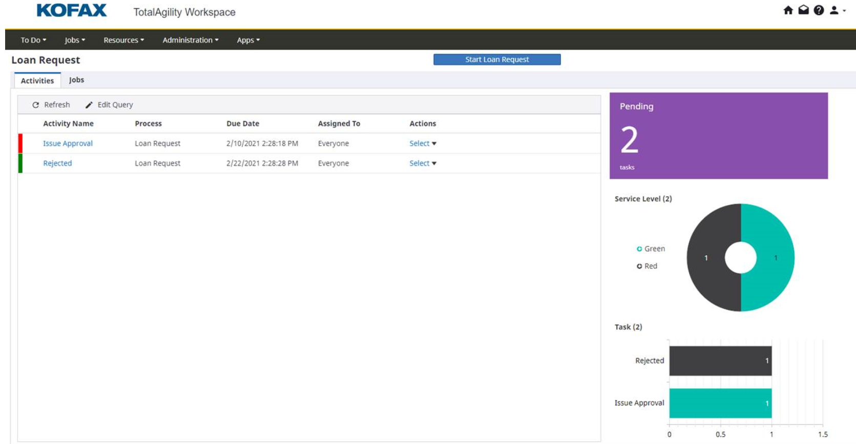 The applications published in Quick Workflow are available in Workspace along with a landing page; this page provides a dashboard from which you can create new instances of your workflow, take and complete activities, view job properties and monitor statistics on the jobs.