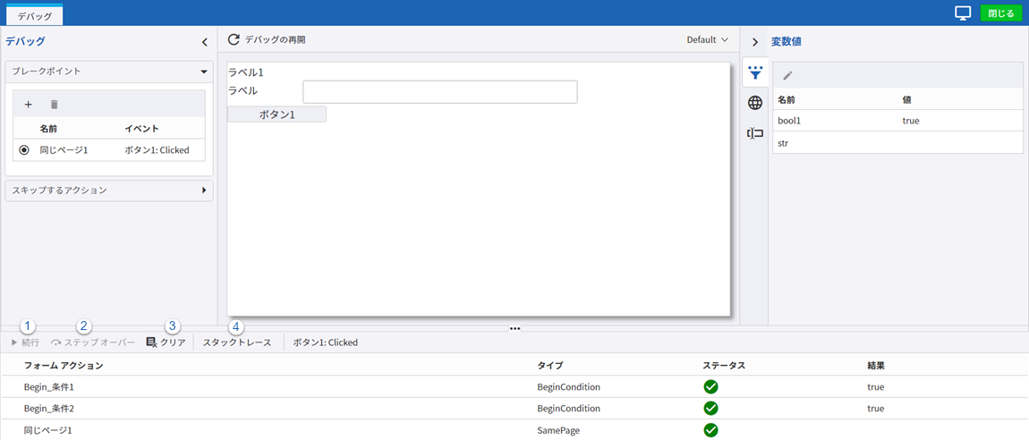 または、フォームの [アクション] バーで [デバッグ] をクリックします。