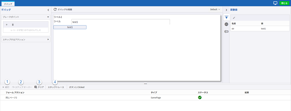 ブレークポイントに到達したときに、.Net アクションなどのサーバー側のアクションを展開し、コントロール、フォーム変数、およびグローバル変数の値を表示および更新して、実行を継続できます。
