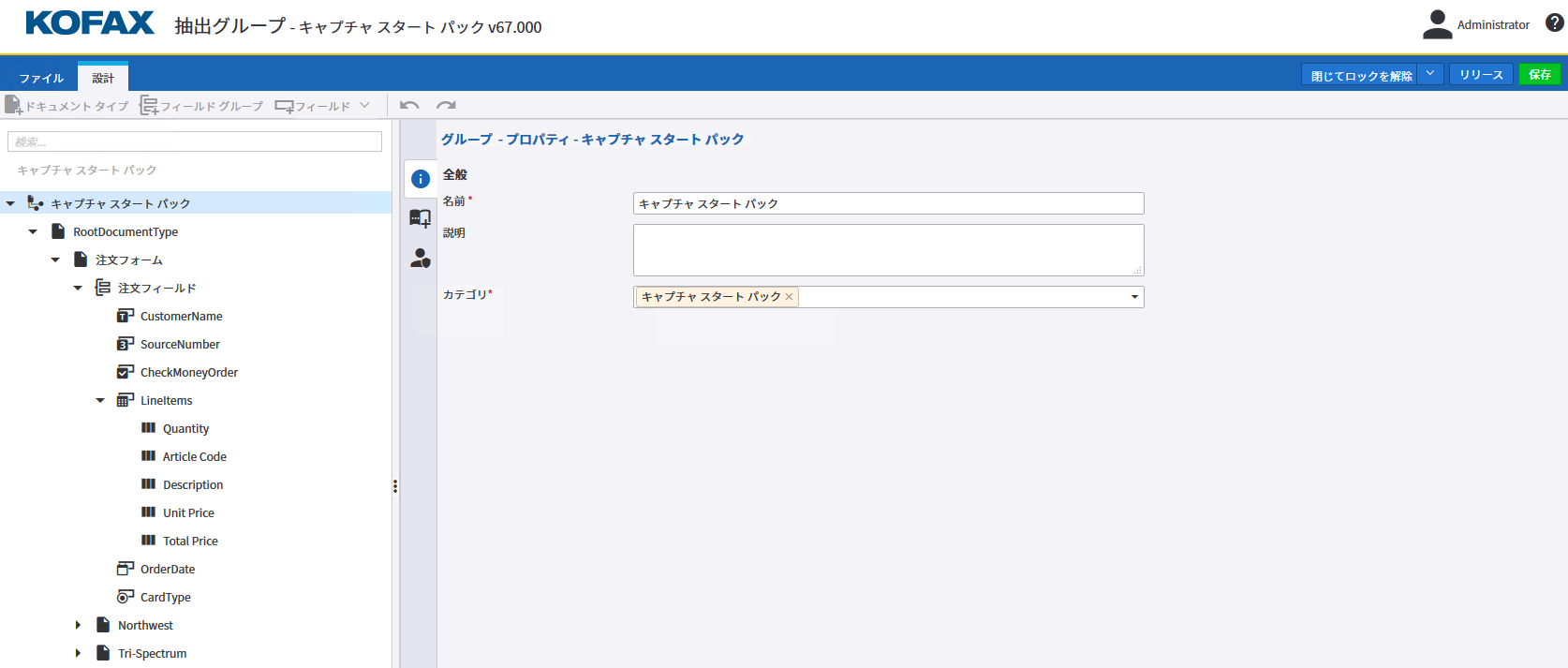 キャプチャ スタート パック抽出グループを開くには、[キャプチャ] に移動して、[抽出グループ] をクリックします。[抽出グループ] ページの [カテゴリ] リストで、[キャプチャ スタート パック] を選択します。キャプチャ スタート パック抽出グループがリストに表示されます。キャプチャ スタート パックをクリックします。新しいブラウザ タブで抽出グループが開きます。注文フォーム ドキュメント タイプを展開して、他のドキュメント タイプを表示します。必要なドキュメント タイプ名を検索することもできます。