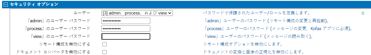 の表示を制御します。 - [管理者のパスワード]: 管理者ユーザーのパスワード。このパスワードにより、適切な認証がない場合の Message Connector のリモート設定を制限します。