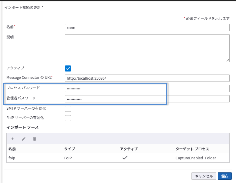 [プロセス パスワード]: プロセス ユーザーのパスワード。このパスワードにより、Message Connector でのドキュメントのインポートおよび Message Connector Monitor での