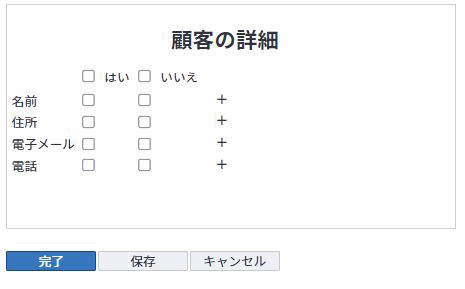 「Customer Details」テンプレートの場合、「Yes」(はい) や「No」(いいえ) のような 2 つの列を作成すると、実行時にテンプレートのチェックリスト項目ごとに 2 ずつオプションが表示されます。