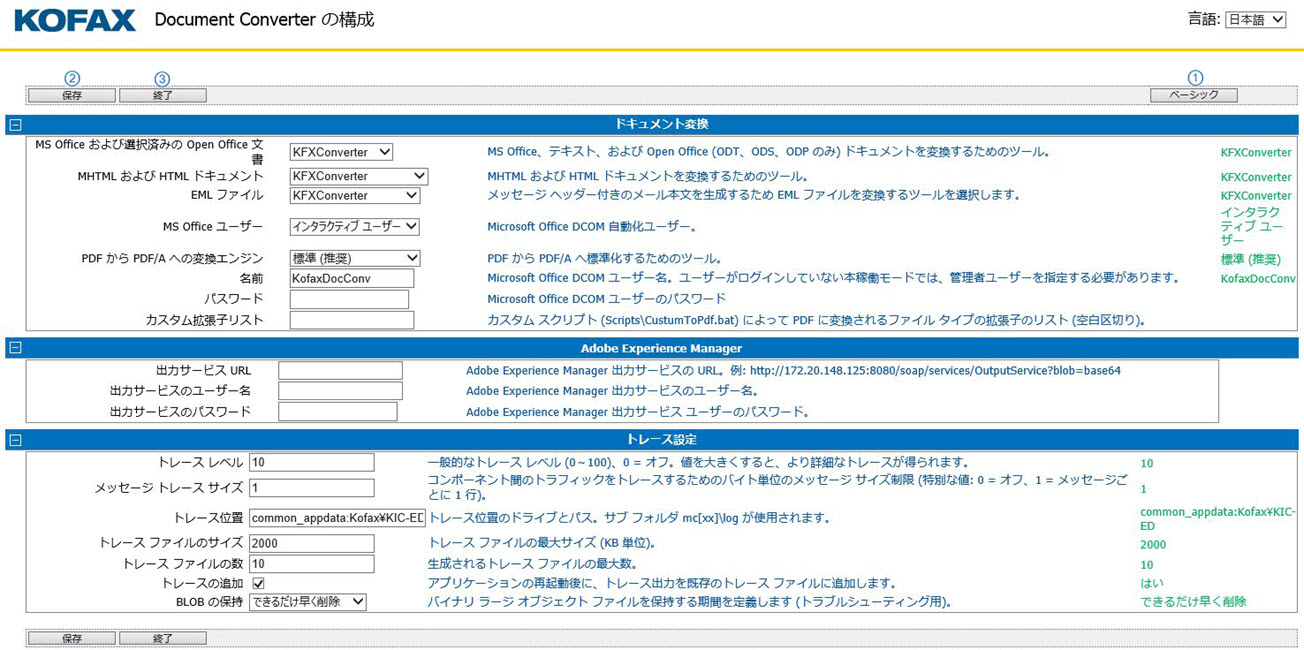 [詳細] と [ベーシック] の切り替えボタンにより、構成設定の詳細を表示または非表示にします。 注 Azure 環境では、ドキュメント変換はデフォルトの構成設定のみを使用し、設定を変更することはできません。