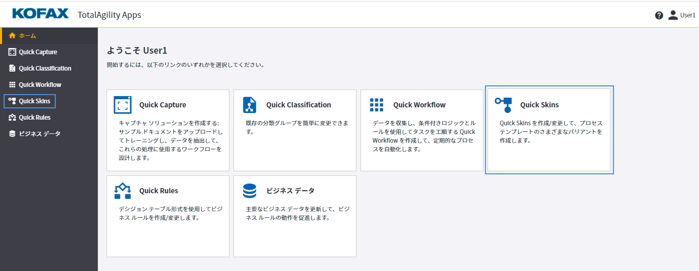 Kofax TotalAgility をインストールすると、Quick Skins が自動的にインストールされ、[TotalAgility Apps] の下に配置されます。Quick Skins アプリケーションを使用するには、以下にアクセスできることを確認します。