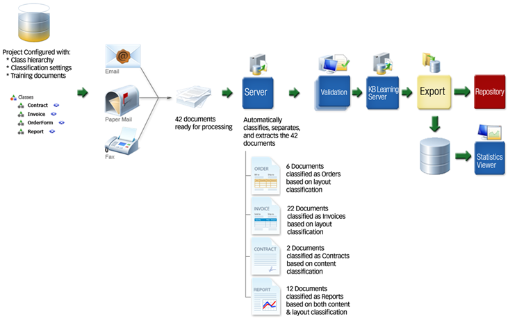 The Layout Classifier and Adaptive Feature Classifier both support learning by example. The first step is to assign sample documents to each class. The classification engines then perform a training process, where all the sample documents are analyzed and the important features are extracted and used to define the classification result for each class. The following steps occur: