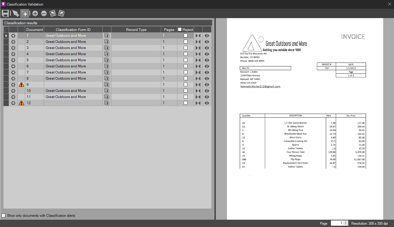 All documents/pages appear within the interface. Users can identify exceptions by seeing the yellow alert triangles in the Classification Alert column.