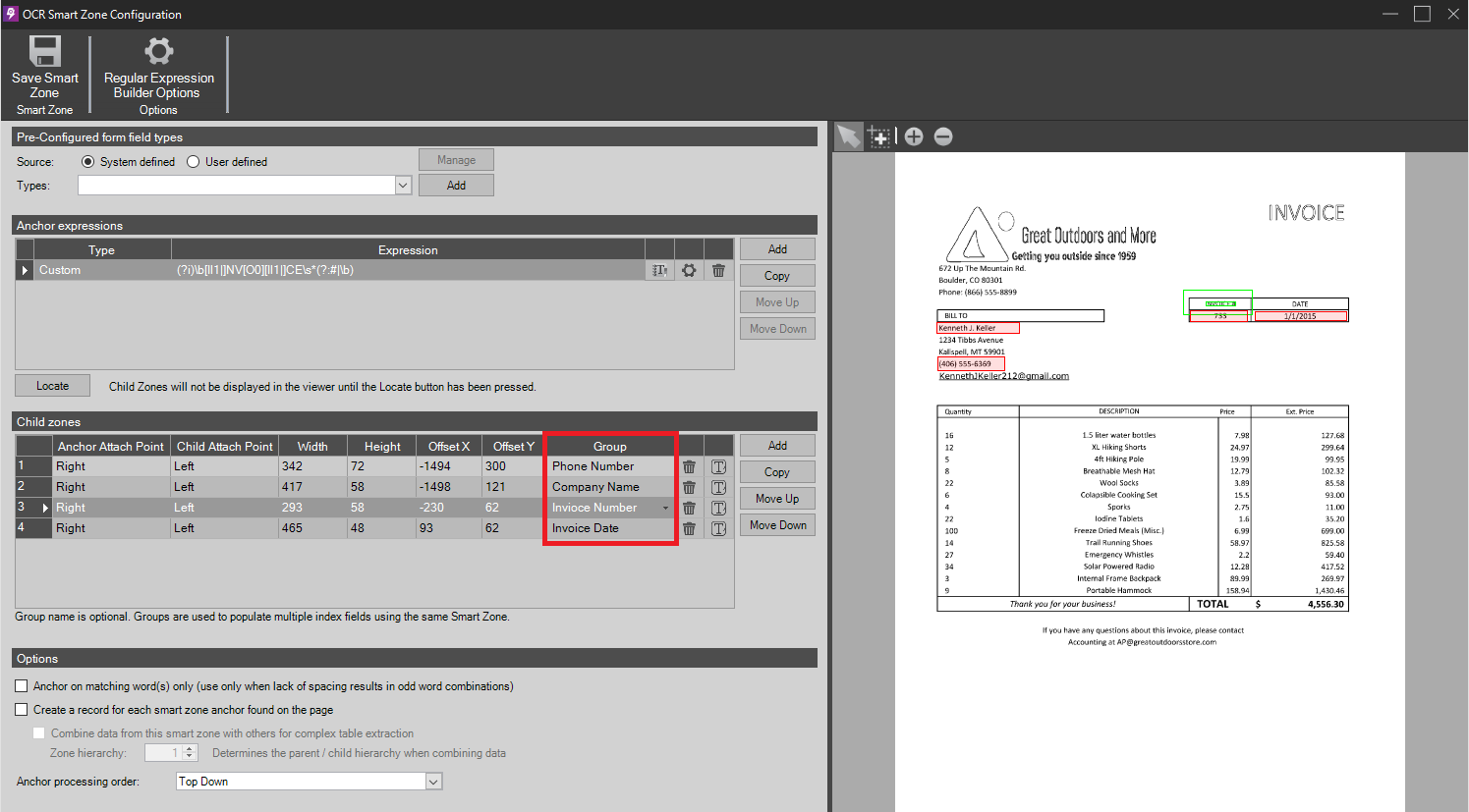 In the example below, we have one anchor that looks for the text "Invoice". This anchor has four child zones. From this single anchor, we can locate and capture the invoice number, invoice date, company, and phone number.