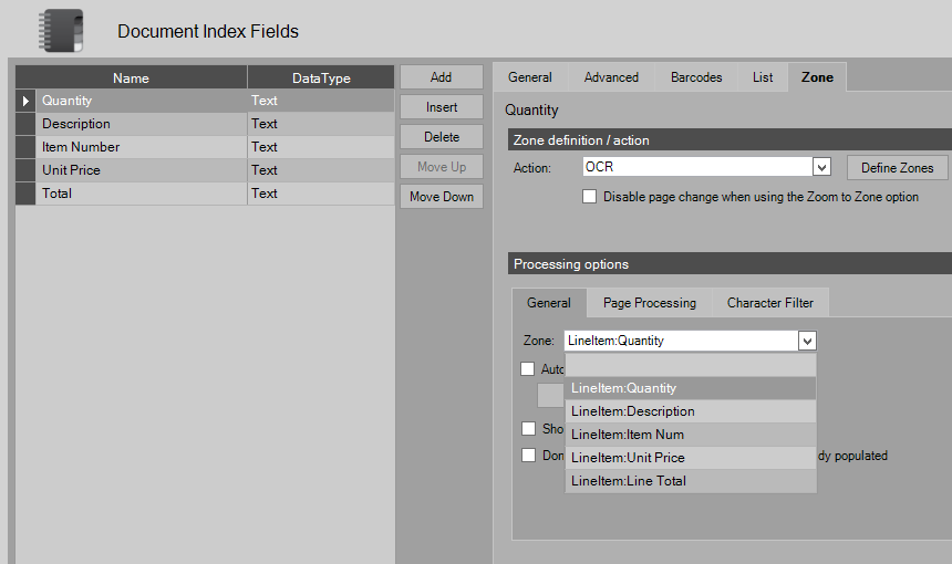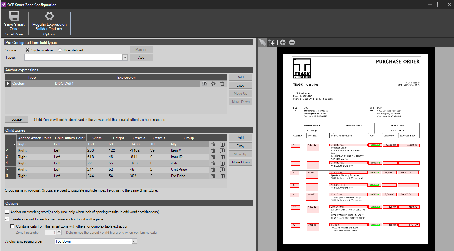 In the example below, the OCR Smart Zone anchors on the quantity column numeric values. Whenever one is found, the child zones gather the data from the line item: