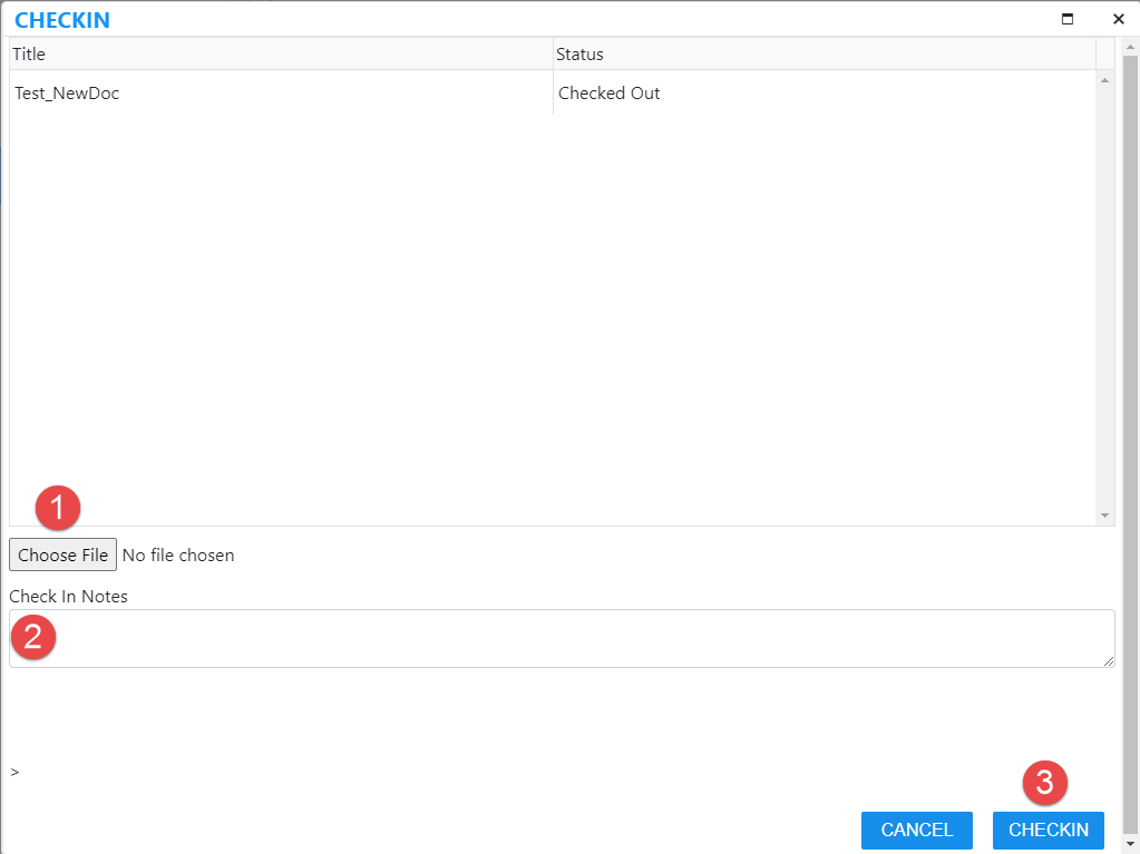 Select the content to upload as a part of the Checkin by clicking the Choose File button [1], as seen here: