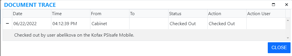 Tracing allows users to track the changes performed on a document with a detailed breakdown of how the document has changed hands within the application. For example, a document may be sent through Workflow to a specific user, and after that user performs some edits, they may send it to a different user. Sometimes the sending and receiving of documents occurs automatically depending on the Workflow configuration. While workflow functionality is not currently supported in this version of PSIsafe Web, the Trace function still allows users to track who has created, edited, and modified content within your PSIsafe Web installation.