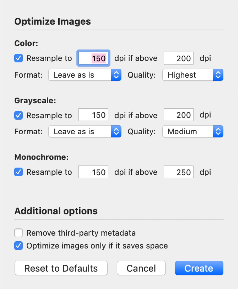 Tip: There is a small trick to get resampling to work. Besides choosing a lower dpi, next to the "Color JPEG compression" dropdown menu, there should be a percentage indicator—normally choosing 50% lowers file size considerably while retaining good quality.