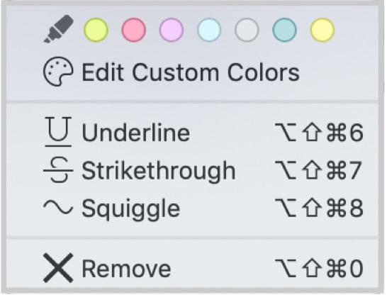 - Click the down arrow next to the Highlight button in the Toolbar to view the markup choices, then pick one. Alternately, right-click or Control-click on the selected text. A context menu will appear with options for applying a highlight color, underline, strikethrough, or squiggle.