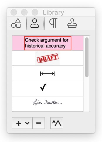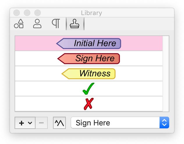 Drag stamps into your document. Choose from Standard Business, Sign Here, Dynamic Stamps or User Defined. The name in a dynamic stamp is set in the Editing preferences.