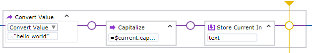 1. As you continue the execution, the expression is capitalized by the converter (note =$current.capitalize() in the following example), the variable $current is assigned a new value, "Hello World", while the $initial variable value remains unchanged. The new value of the $current variable, "Hello World", is stored in the variable text of type text after the Store Current In step is executed.