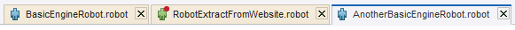 Important Only one Basic Engine Robot at a time can have the execution privilege, so to take the execution privilege from one robot to another, open the tab with the required robot and click Prepare Execution. Also, while multiple Basic Engine Robots can execute in Debug mode at the same time, only one Basic Engine Robot at a time can have the privilege to execute in Design mode. The robot that has the execution privilege in Design mode can also run in Debug mode at the same time, so you can switch between the two modes.When a Basic Engine Robot has the execution privilege, the editor tab of this robot is highlighted. When a Basic Engine Robot is calling a Robot, the tabs of both robots are highlighted for convenience as shown below. The robot where execution is currently located is marked with a red dot.