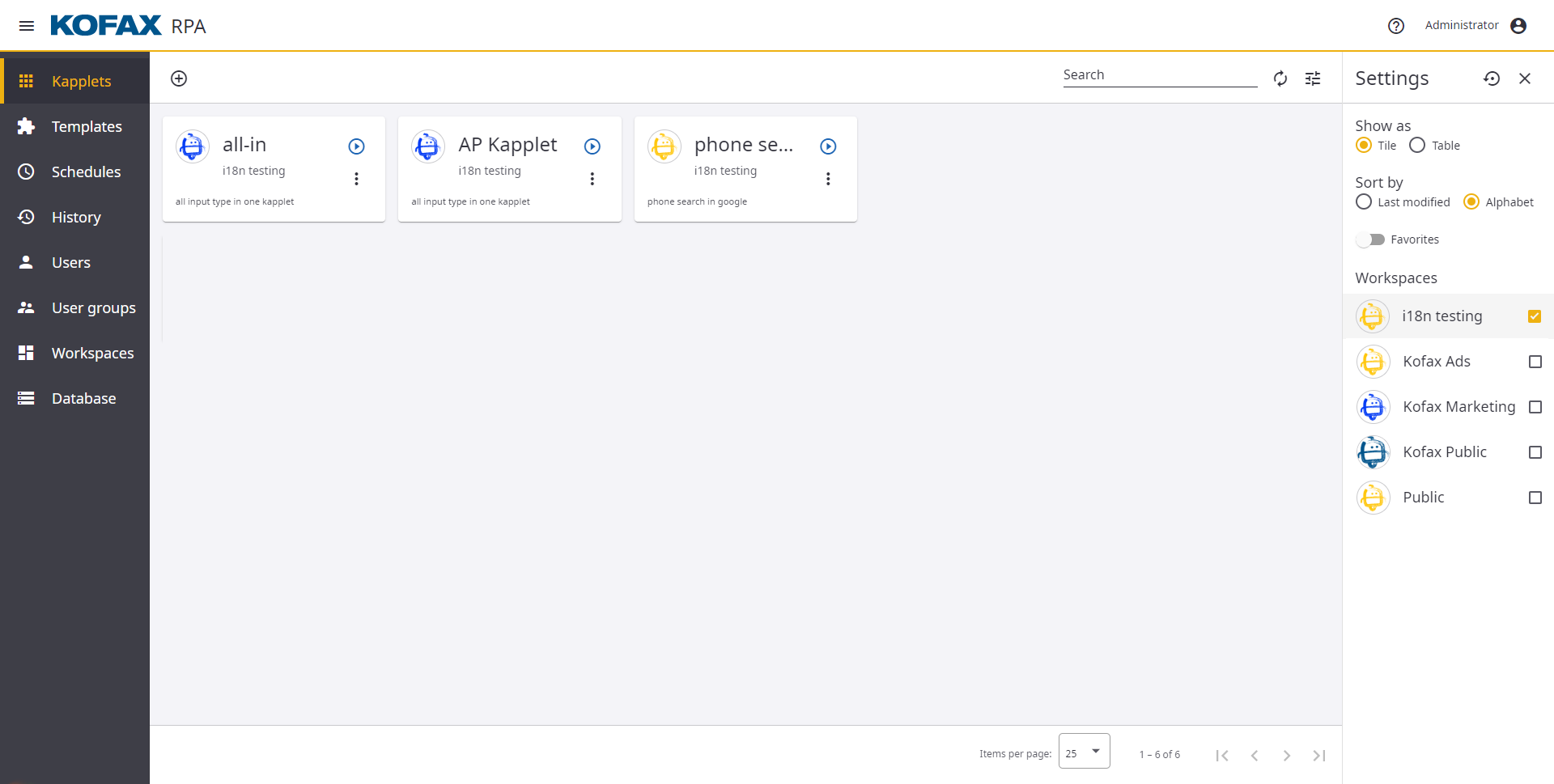 The Kofax RPA Kapplets has a web-based user interface. It gives you the ability to work with Kapplets not only from the computer, but also from a mobile device such as a smartphone or a tablet.