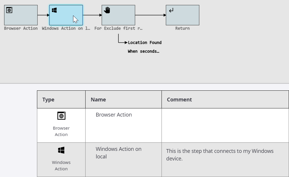 When you move the pointer to any step inside the robot structure, it is highlighted in the table with the description of steps.