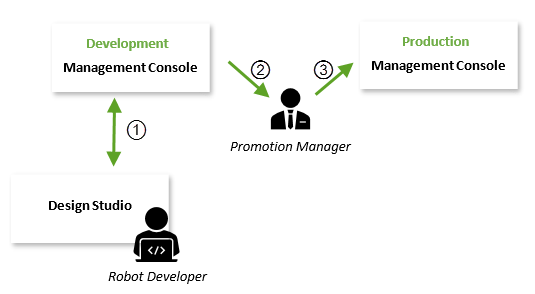 In this example setup, the Robot Developer establishes the synchronization (1) with a project stored in the development Management Console, creates new objects or makes changes to the existing objects, and then synchronizes the project again with that Management Console.