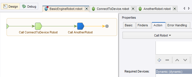 A static device in a Robot is a device to which the connection is already established. If a dynamic mapping is specified for a Call Robot step in the Required Devices property of the Basic Engine Robot, and the device has previously been connected to, this dynamic mapping can be passed to a static device. In other words, if the device is previously connected using the dynamic mapping, in the Devices pane in the Robot, you can select to use a static device and reuse the connection established with the dynamic mapping. This is convenient when you need to reuse this Robot in different Basic Engine Robots.