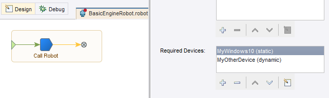 A static device in a Robot is a device to which the connection is already established. If a dynamic mapping is specified for a Call Robot step in the Required Devices property of the Basic Engine Robot, and the device has previously been connected to, this dynamic mapping can be passed to a static device. In other words, if the device is previously connected using the dynamic mapping, in the Devices pane in the Robot, you can select to use a static device and reuse the connection established with the dynamic mapping. This is convenient when you need to reuse this Robot in different Basic Engine Robots.