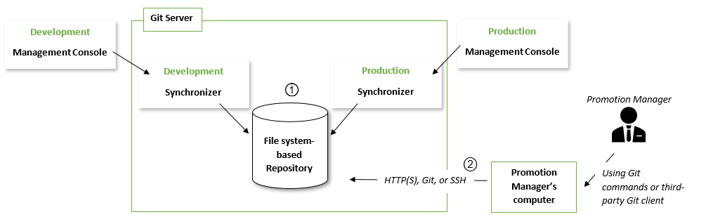 We recommend that you run both instances of the Synchronizer on the same computer where the repository is stored (1). With this setup, the Promotion Manager can use one of the supported Git protocol standards (2) to access the repository and push changes to production.