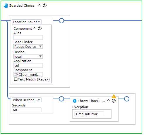 The guarded choice step is used to set up a number of conditions, each associated with some actions. Whichever condition or guard is satisfied first, its associated actions or steps are executed. This is often used to ensure that an interface element, such as a button, is present before trying to move to and click it. To avoid waiting indefinitely, a timeout guard is added. In Kofax RPA, you can use location and timeout guards to make sure the robot finds the required elements and works as designed.