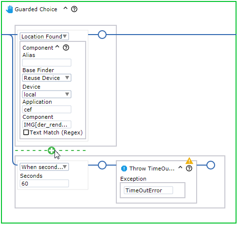 To manually add a guard to a Guarded Choice step, hover your mouse over the bottom line of the guard frame until you see a green plus sign and click the plus to add a guard. See the following example.