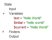1. As you continue the execution, the expression is capitalized by the converter (note =$current.capitalize() in the following example), the variable $current is assigned a new value, "Hello World", while the $initial variable value remains unchanged. The new value of the $current variable, "Hello World", is stored in the variable text of type text after the Store Current In is executed.