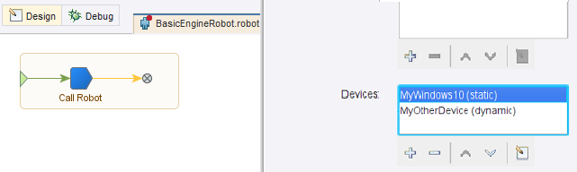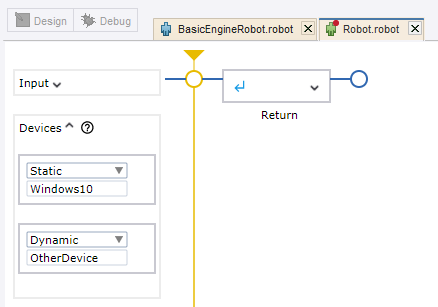 A static device in a Robot is a device to which the connection is already established. If a dynamic mapping is specified for a Call Robot step in the Devices property of the Basic Engine Robot, and the device has previously been connected to, this dynamic mapping can be passed to a static device. In other words, if the device is previously connected using the dynamic mapping, in the Devices pane in the Robot, you can select to use a static device and reuse the connection established with the dynamic mapping. This is convenient when you need to reuse this Robot in different Basic Engine Robots.