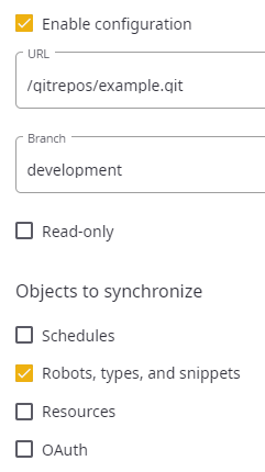 5. Under Objects to synchronize, select the objects to include in the synchronization: Robots, types, and snippets.