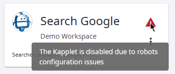A Kapplet becomes disabled if a robot in the Kapplet is removed or changed. The following notification is displayed.