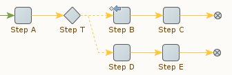 Si l'étape B est exécutée avec succès, l'exécution des étapes se déroule comme suit : « A, T, B, C. ». Comme la première branche sortant de T s'exécute sans erreur, la deuxième branche n'est pas exécutée du tout.