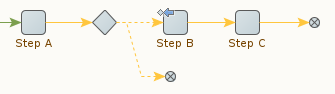 En raison de cette frontière floue entre l'exécution conditionnelle et le traitement des erreurs, Design Studio fournit les deux fonctionnalités de manière unifiée. Pour chaque étape, vous pouvez définir l'activité en cas d'erreur. En outre, les étapes avec une activité de test (basée sur une condition d'un certain type) réutilisent la même approche, ce qui signifie que si la condition n'est pas remplie, l'activité (par défaut) est appliquée comme si une erreur s'était produite.