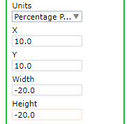 Les valeurs sont calculées par rapport au coin supérieur gauche de la page. Si un champ contient une valeur négative, le calcul s'effectue par rapport à la dimension appropriée de la page. Si Largeur ou Hauteur est définie sur 0, la dimension de page est utilisée à la place.