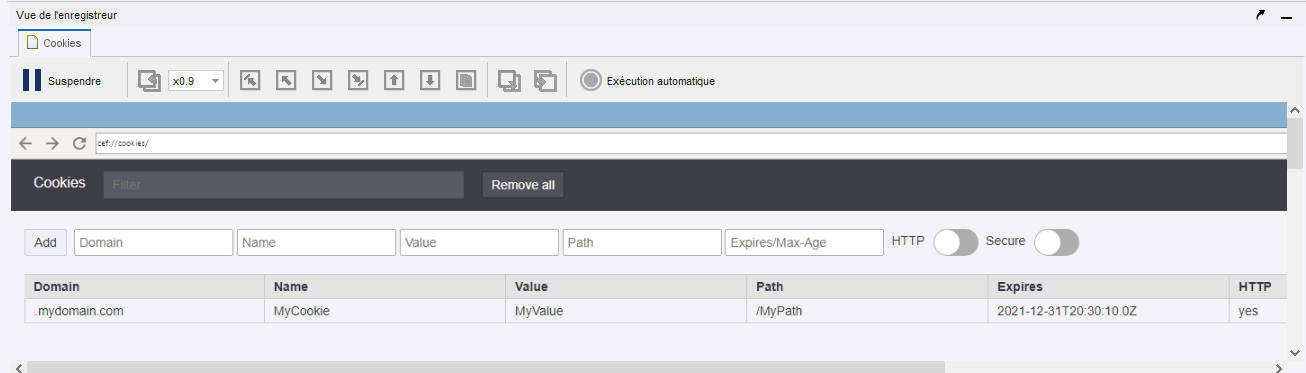 Utilisez le navigateur intégré du robot pour surveiller, ajouter ou supprimer des cookies du CookieStore.