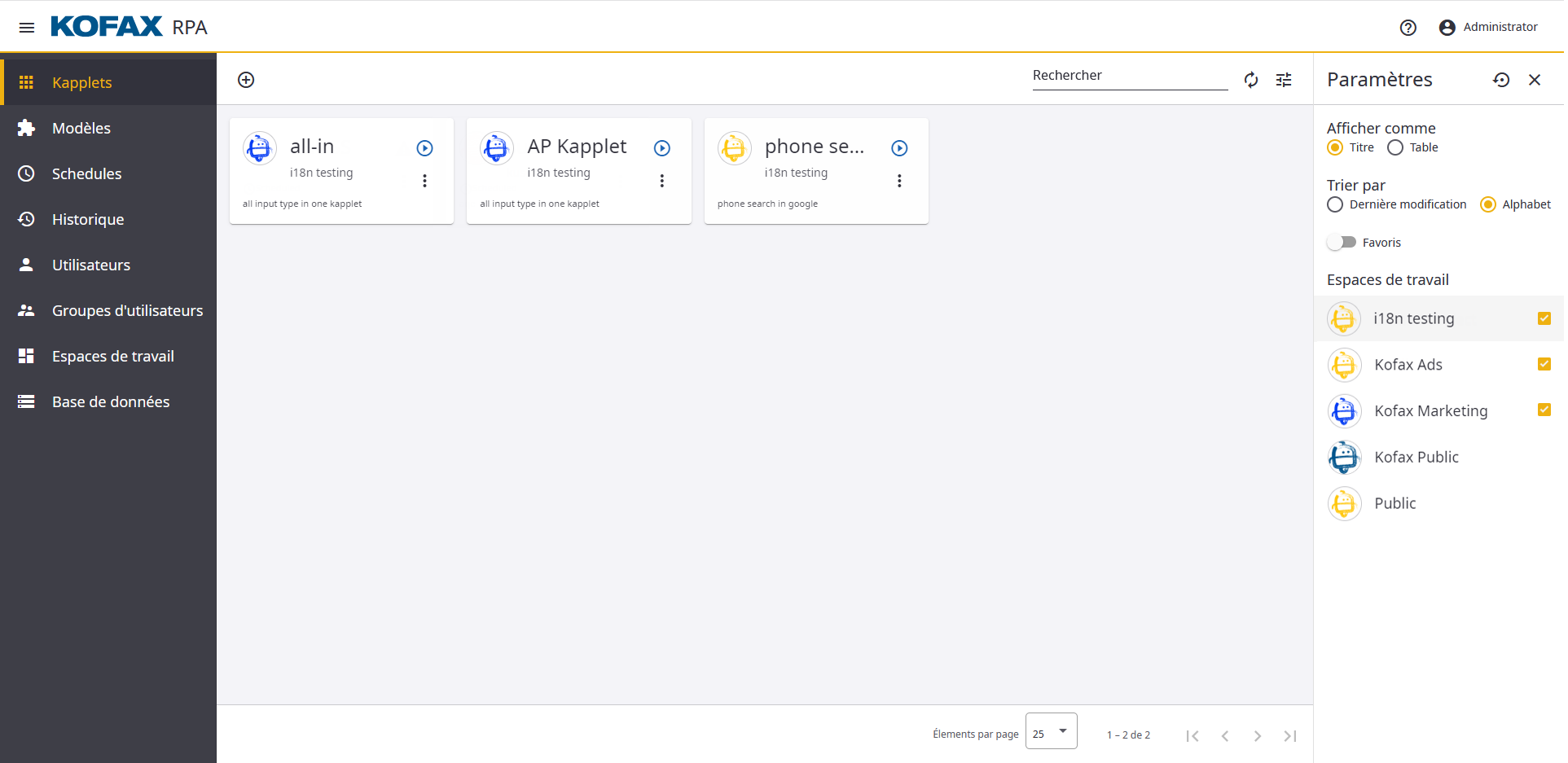 Utilisez les onglets du menu latéral pour naviguer sur le Kofax RPA Kapplets.